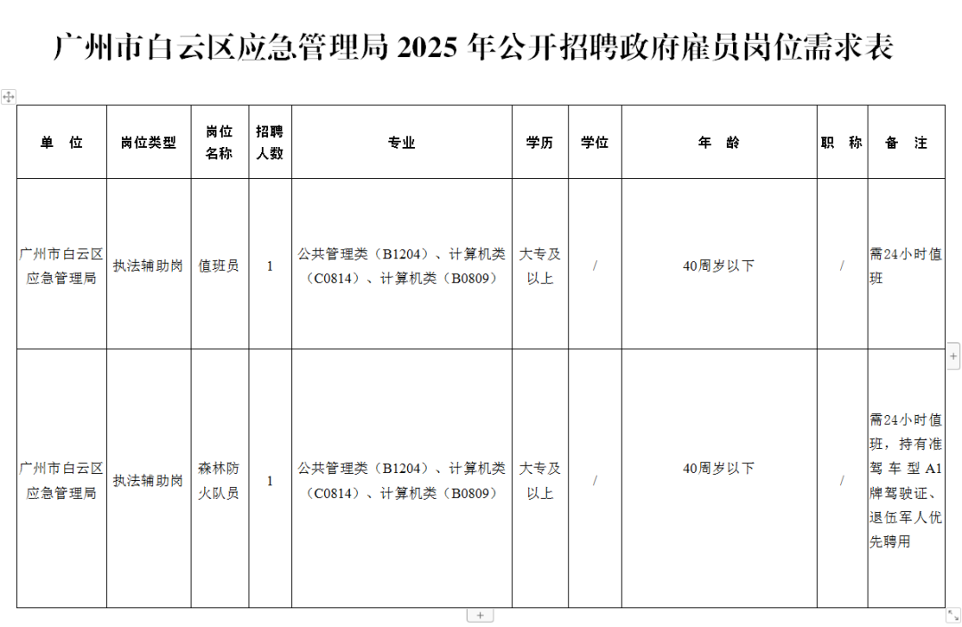 广州市白云区应急管理局计划面向社会公开招聘政府雇员(执法辅助岗)2名,其中,值班员1名,森林防火队员1名。
